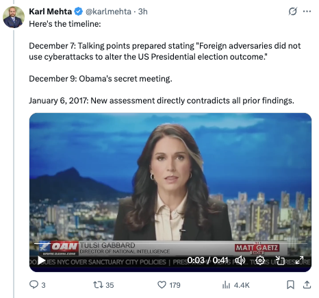 I voted for Obama twice. Tulsi Gabbard's accusations (substantiated by hundreds of newly declassified documents) show that the conduct of Obama's WH (including Obama himself) was despicable. This was an attack on democracy itself. I would like to see this matter vigorously investigated and prosecuted. I cross-posted this on FB, where I expect that some people on FB will avoid the facts by launching baseless ad hominem attacks on Tulsi Gabbard.