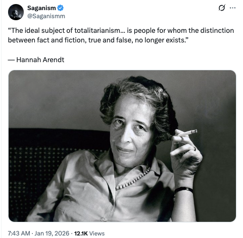 “The ideal subject of totalitarianism... is people for whom the distinction between fact and fiction, true and false, no longer exists.”